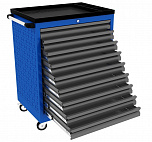 Тележка инструментальная PROFFI 950.9  комплектуется 9 выдвижными ящиками. Тележки изготовлены высотой 950 мм. Размеры: 950x660x470 мм. Масса: 57,5 кг. Грузоподъемность ящиков до 30 кг.
