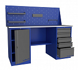 Верстак двухтумбовый поставляется в разобранном виде (4 элемента). Нагрузка на столешницу до 600 кг. Стандартный цвет: корпус - серый глянец RAL 7030, ящики и двери тумб - синий RAL 5017.  Размеры: 855x1600x700 мм. Масса: 83 кг.