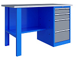Однотумбовый. Допустимая нагрузка на столешницу 750 кг. Опорные элементы выполнены сварными из холоднокатаной стали. Верстак состоит из столешницы, поры, тумбы P4 с двумя малыми и двумя большими ящиками, полки-стенки и одинарного экрана с кронштейнами. Все металлические элементы покрыты полиэфирной порошковой краской. Столешница состоит из фанеры марки ФСФ толщиной 24 мм, которая покрыта лаком-антисептиком и листом оцинкованной холоднокатаной стали толщиной 1,2 мм. Размеры (ВхШхГ) 1470x1396x696 мм.