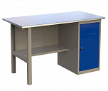 Однотумбовый. Допустимая нагрузка на столешницу 750 кг. Опорные элементы выполнены сварными из холоднокатаной стали. Верстак состоит из столешницы, опоры, тумбы P5 с четырьмя малыми и одним большим ящиком, полки-стенки, двойного экрана с кронштейнами и комплекта освещения. Столешница состоит из фанеры марки ФСФ толщиной 24 мм, которая покрыта лаком-антисептиком и листом оцинкованной холоднокатаной стали толщиной 1,2 мм. Размеры (ВхШхГ) 1965x1396x696 мм.