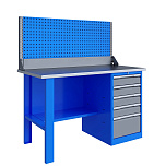Однотумбовый. Допустимая нагрузка на столешницу 750 кг. Опорные элементы выполнены сварными из холоднокатаной стали. Верстак состоит из столешницы, опоры, тумбы P5 с четырьмя малыми и одним большим ящиком, полки-стенки и одинарного экрана с кронштейнами. Все металлические элементы покрыты полиэфирной порошковой краской. Столешница состоит из фанеры марки ФСФ толщиной 24 мм, которая покрыта лаком-антисептиком и листом оцинкованной холоднокатаной стали толщиной 1,2 мм. Размеры (ВхШхГ) 1470x1396x696 мм.