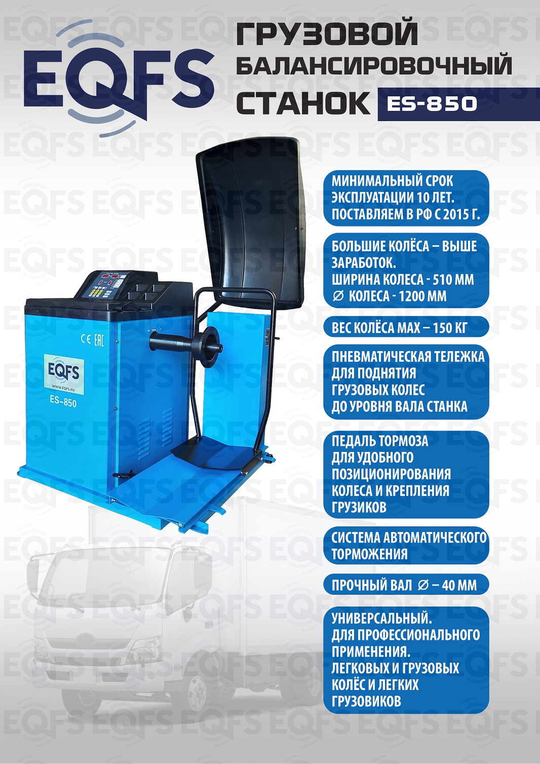 + ES-850 Балансировочный станок для балансировки колес легковых и грузовых автомобилей. Колесо «в сборе» Ø до 1200 мм, вес до 150 кг. Диски Ø 13-24” ширина 1,5-20”, подключение 380 В. Встроенный пневмоподъемник.  Гарантия до 18 мес.