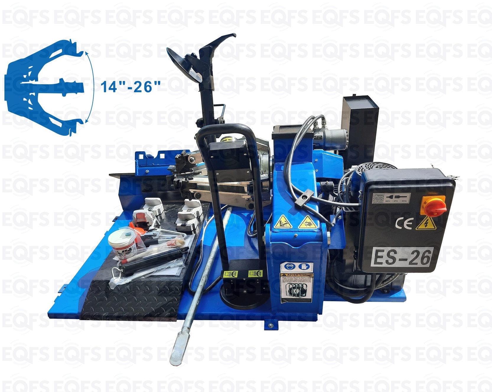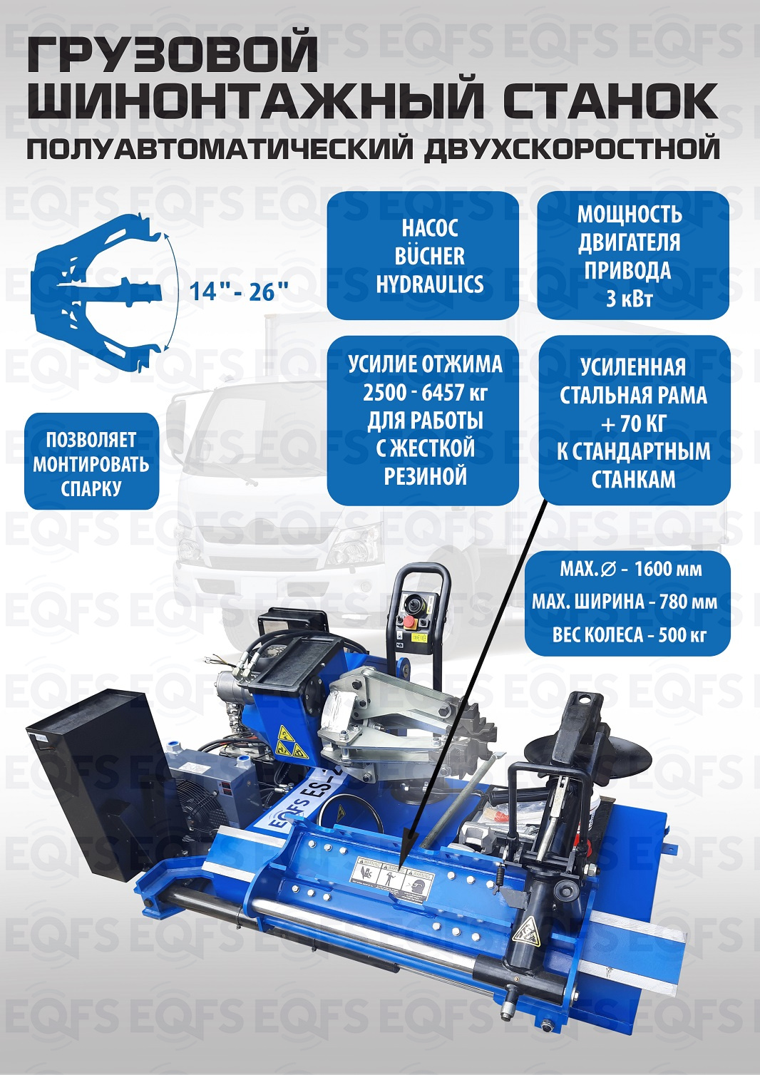 ES-26 грузовой шиномонтажный станок Нет редуктора- нет трущихся деталей. Защита от перегрузок и неправильной эксплуатации. Усиленная стальная рама. Мобильная консоль управления.  2-х скоростной, 14÷26”. Мощность привода 3,0 кВт. Гарантия 18мес. Диски сталь, AL, с кольцами и без. Колесо макс. Ø1600 ширина 780мм, до 500кг.