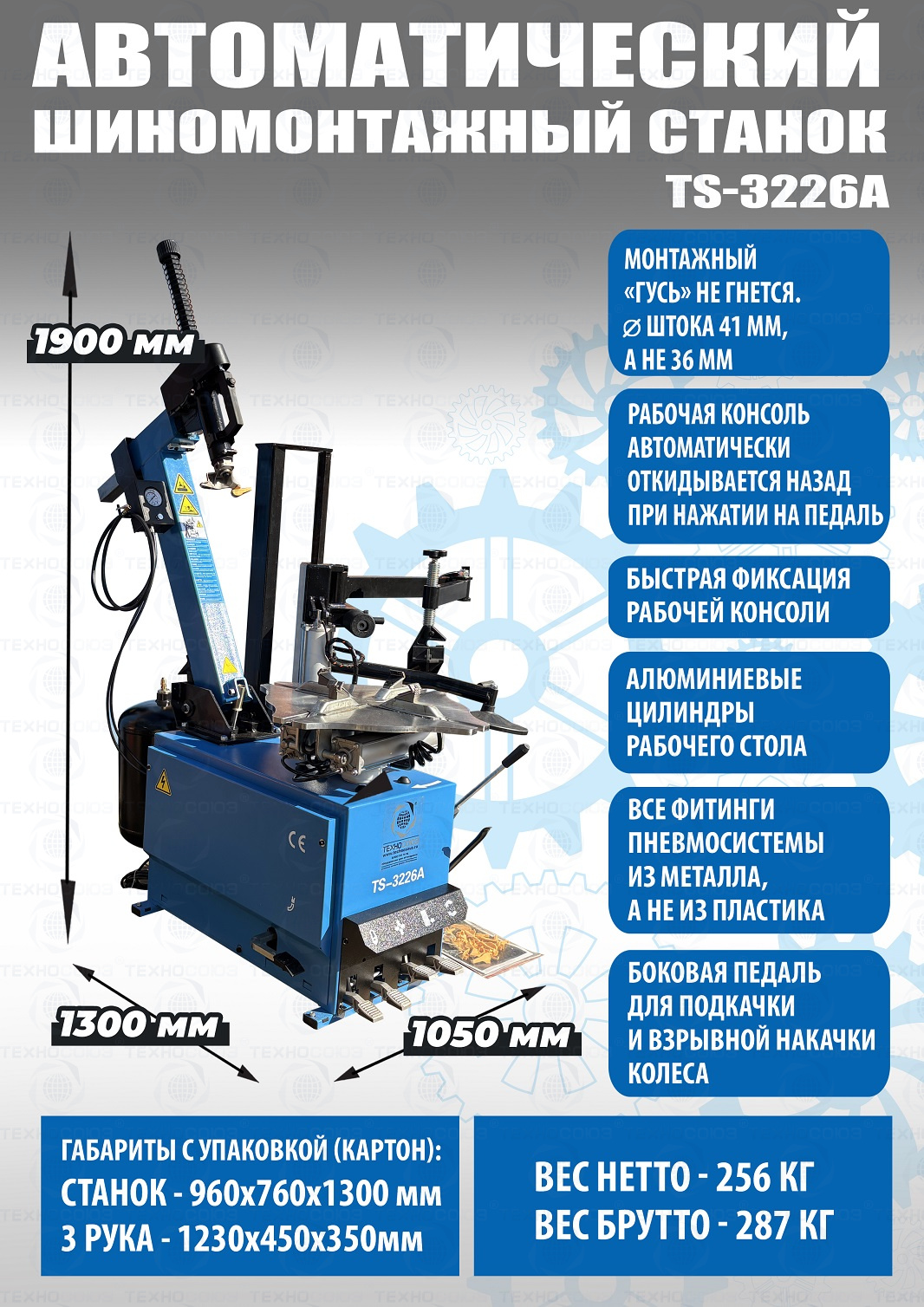 Автоматического шиномонтажного станка TS-3226А для колес легковых автомобилей, легких грузовиков, не больших автобусов и коммерческой техники. Для дисков: 11÷24”. В комплекте: полноценная 3-я рука для работы с жесткой и низкопрофильной резиной RUNFLAT. + встроенный бустер 24 литра (взрывная подкачка) + пистолет для подкачки шин + монтажка + регулятор давления с влагоотделителем и манометром.