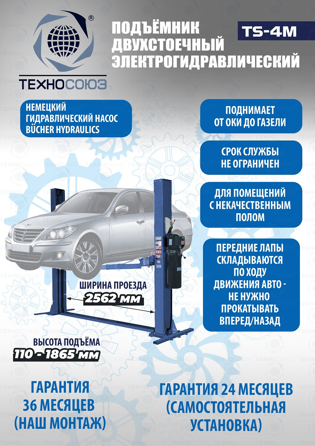 • Гарантия 24 месяца. Гарантия не распространяется на использование подъемника не по назначению. В случае ввода в эксплуатацию подъемника специалистами нашей технической службы гарантия увеличивается до 36 месяцев. При условии прохождения ежегодного технического обслуживания сервисной службой ООО "ТЕХНОСОЮЗ" или уполномоченными дилерами.