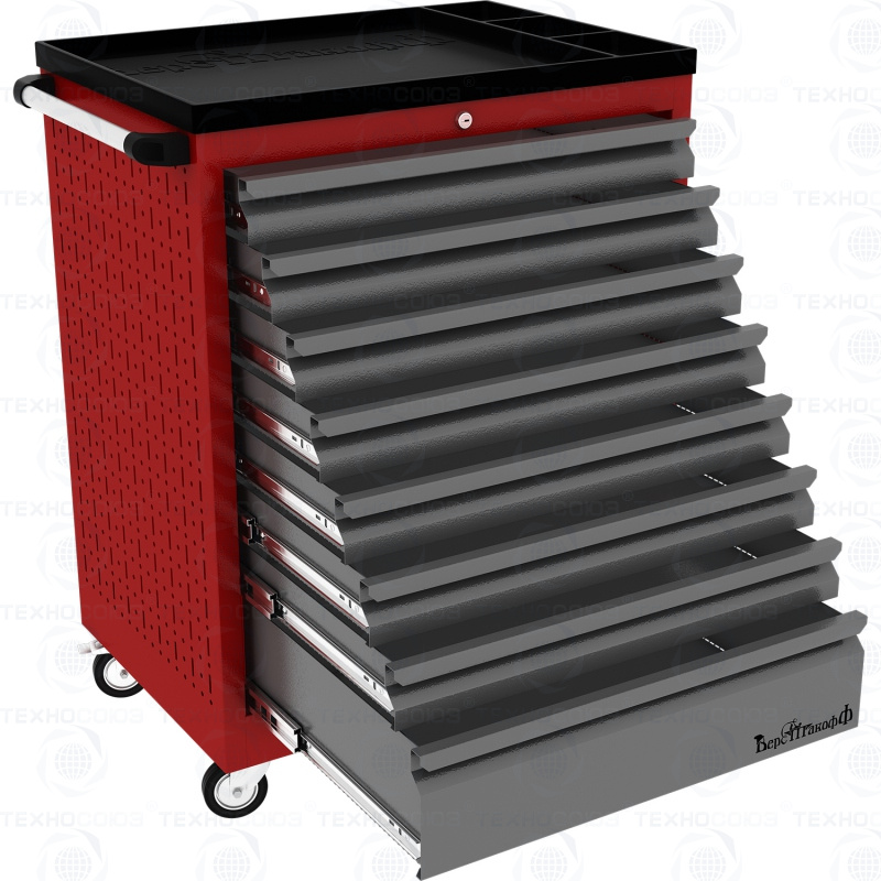 Тележки инструментальные серии PROFFI 950 предназначены для использования на предприятиях любого профиля занятых ремонтом и изготовлением различной продукции. На боковые стенки инструментальной тележки нанесена перфорация размером 25х25 мм и диаметром отверстия 8 мм, что позволяет устанавливать на них навесной инструмент или крючки. Наибольшей популярностью тележки инструментальные пользуются в сфере авторемонта и обслуживания автомобилей .Тележки имеют выдвижные ящики на шариковых телескопических направляющих полного выдвижения с фиксацией в закрытом положении, предотвращающее открывание при передвижении тележки. Ящики имеют центральный замок, который позволяет ограничить доступ посторонних лиц к содержимому ящиков. Тележка инструментальная изготовлена из высококачественного металла ведущих Российских производителей, покрашена порошковой краской производства Германии, имеет итальянскую и турецкую фурнитуру. Тележки для инструмента оснащены двумя не поворотными колесами диаметром 100 мм, одним поворотным и одним поворотным со стопором, которое фиксирует тележку и предотвращает непроизвольное скатывание.
